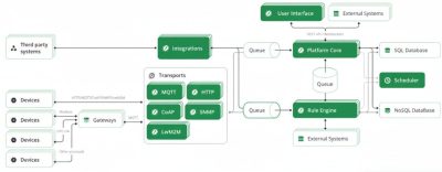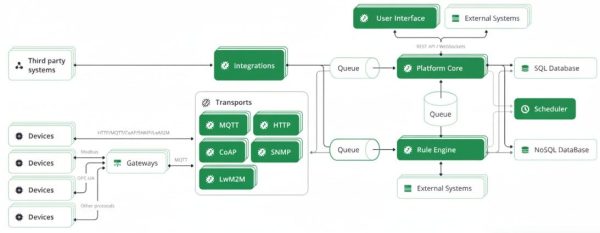 | Giao thức kết nối | MQTT, CoAP, HTTP, LWM2M, SNMP, Modbus, OPC-UA, BACnet, LoRaWAN, Sigfox, AWS IoT, Azure IoT, Kafka, Google Pub/Sub |